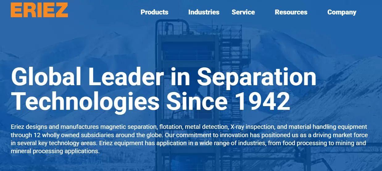 | Eriez | 1942 | Erie, Pennsylvania, USA | Magnetic separators, flotation devices, metal detection, material handling, global network; serves mining, food, chemical, recycling industries |